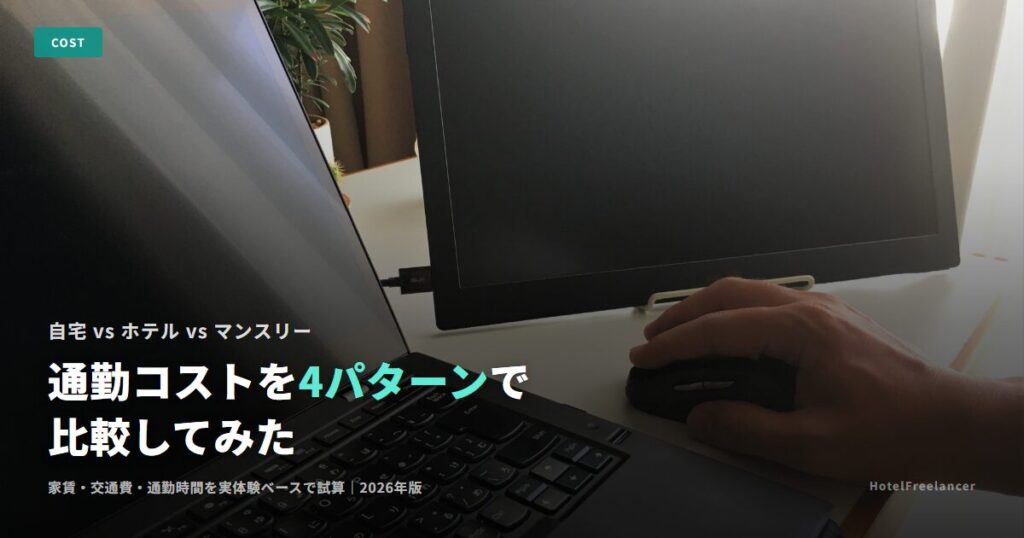 フリーランス×旅・お金 フリーランスエンジニアのホテル暮らし、通勤費・家賃はいくら変わる?2026年版で実際に試算した 通勤ストレスから解放されるホテル暮らし。でも実際の費用は?経費は?手取りは?自宅通勤・平日ホテル・完全ホテルの3パターンを比較し、ノマド生活のリアルなコスパを検証しました。 2026/03/29 フリーランス×旅・お金